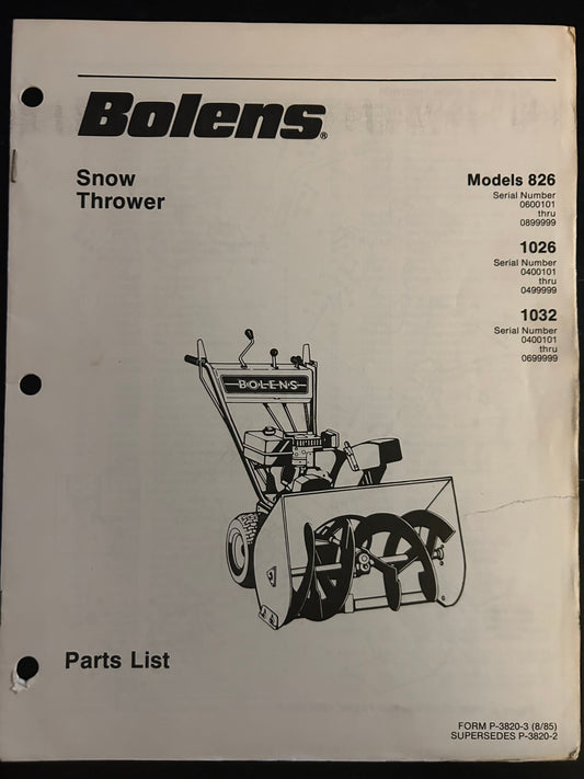 Bolens _ Snow Thrower model 826, 1026 & 1032 _ Parts List