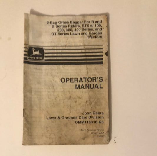 John Deere 2-Bag Grass Bagger for R & S series Riders, STXs, 100, 200, 300, 400 Series & GT Lawn and Garden Tractors _ Operator’s Manual