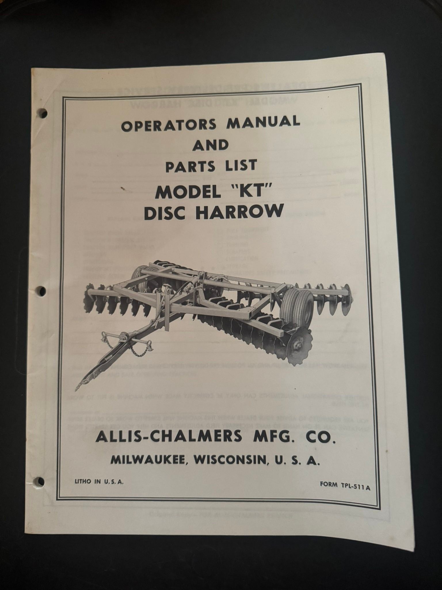 Allis-Chalmers Model KT Disc Harrows _ Operators Manual & Parts List