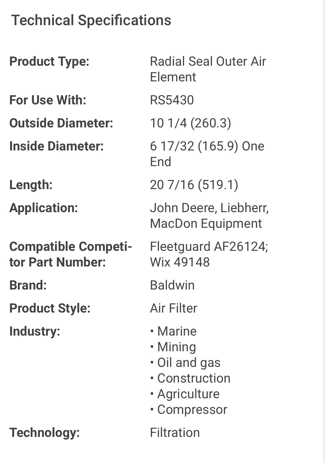 Baldwin Filters RS5429 Outer Air Filter,Radial